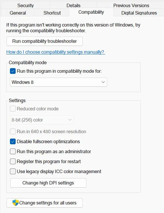 - 選中“以兼容模式運行此程序”並選擇 Windows 8 或 7。