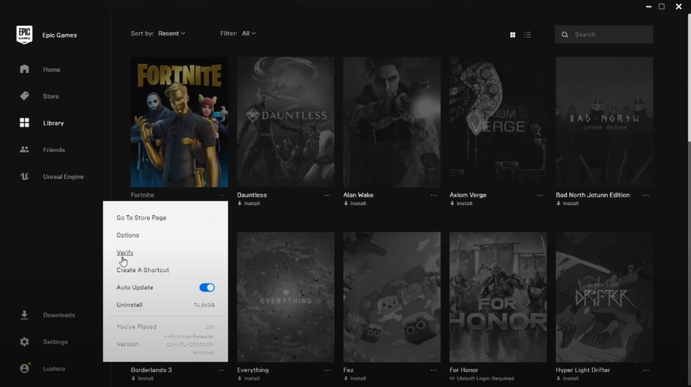 驗證遊戲文件的完整性,這意味著 Epic Games 啟動器將自動下載任何丟失或損壞的 Fortnite 文件。在你的史詩遊戲啟動器,選擇 Fortnite 的漢堡菜單,然後單擊核實