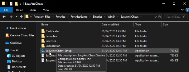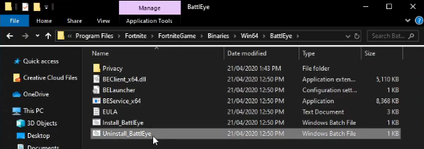 導航到保存遊戲的驅動器,然後轉至 Program Files > Fortnite > FortniteGame > Binaries > Win64 > BattlEye
