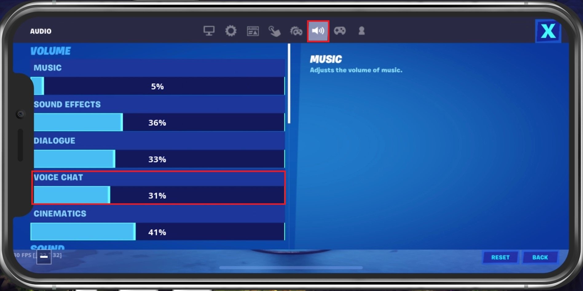 然後,您應該看看您的Fortnite手機聲音的設定.打開Fortnite並導航到您的設定。確保在“音頻”選項卡中將語音聊天音頻滑塊設置為至少15%。對於大多數用戶,根據您的聲音效果音量將是一個好的開始;您可以隨時在遊戲中調整這些設置。