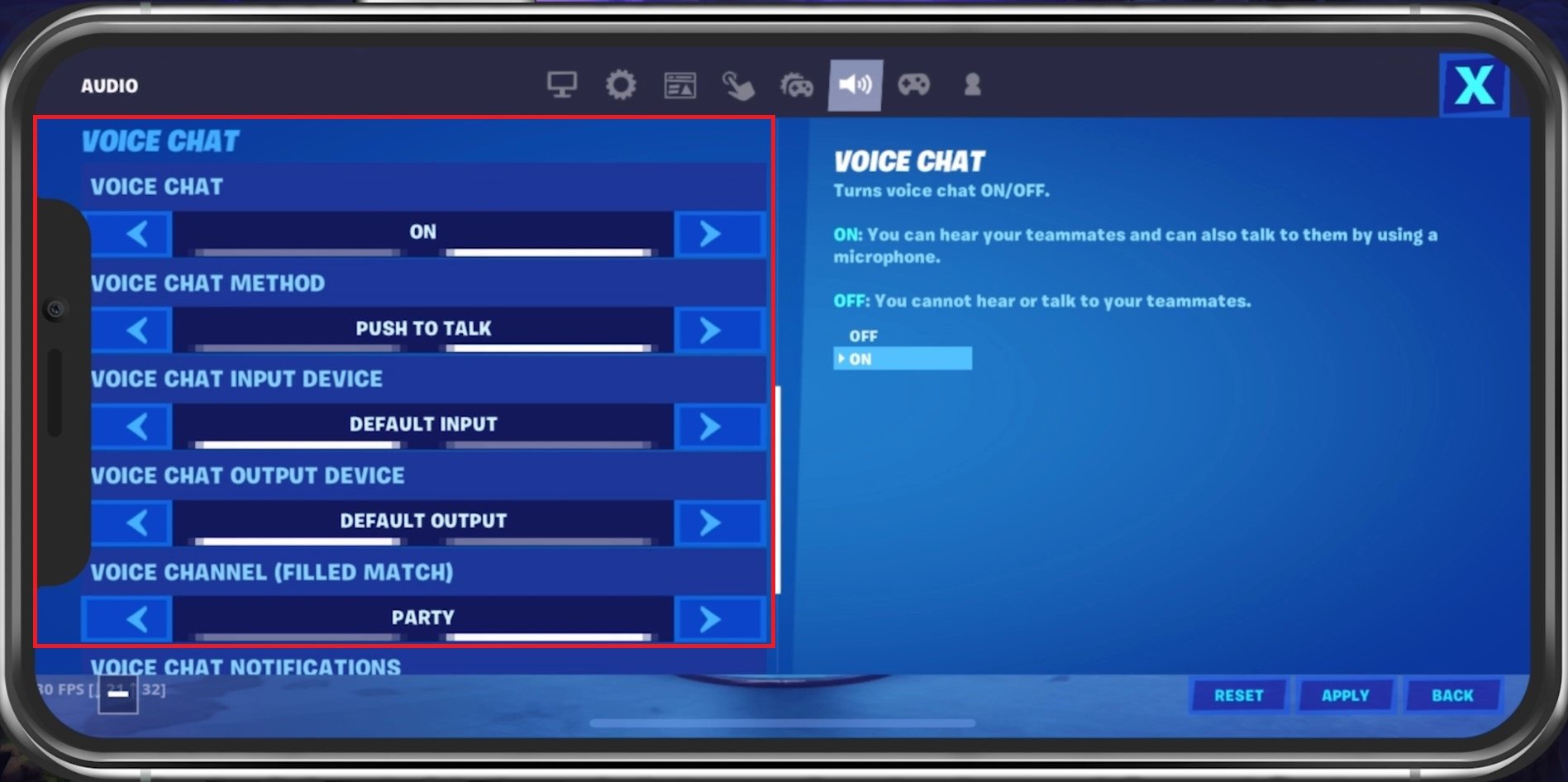 在下面語音聊天,確保啟用語音聊天選項。然後您可以選擇一個語音聊天方法。這應該設置為推動說話。您也可以使用打開麥克風,這會使您大廳中的大多數球員感到煩惱。確保您的默認輸入和輸出設備設置為您想要使用的設備。一些用戶具有他們喜歡使用的外部耳機或麥克風。應用更改後,語音聊天應在Fortnite Mobile中使用。