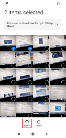 3. 在“垃圾箱”文件夾中,您將找到30天內刪除的所有圖像。只需選擇您想要恢復的照片,然後點擊下面的“恢復”按鈕即可將圖像恢復到您的 Redmi 設備中。