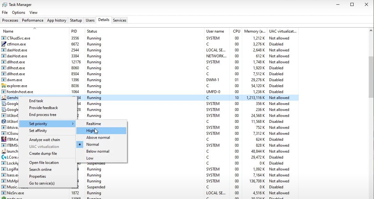 為了進一步提高 PC 上的 Genshin Impact 性能,我們將更改該應用程序相對於後台運行的其他程序的優先級。右鍵單擊任務欄以打開任務管理器。在流程選項卡上,右鍵單擊 Genshin Impact 進程並選擇轉到詳細信息。在“詳細信息”選項卡中,應突出顯示該應用程序。右鍵遊戲進程,將優先級設置為高。