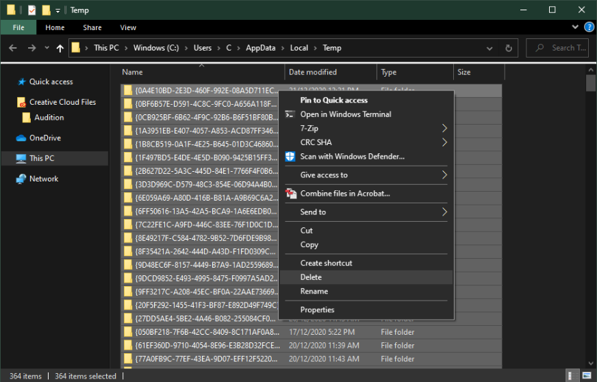 您的硬盤驅動器可能塞滿了不需要的文件。如果未正確刪除,這些文件將導致延遲。您可以手動刪除臨時文件或使用 PC 清理程序,例如 CCleaner。這些應用程序通常是最佳選擇,因為它們會自動保持硬盤驅動器清潔。要手動刪除臨時文件,請輸入%溫度%在任務欄中搜索並按 Enter 鍵。將打開一個新文件夾。確保刪除臨時文件夾的內容。