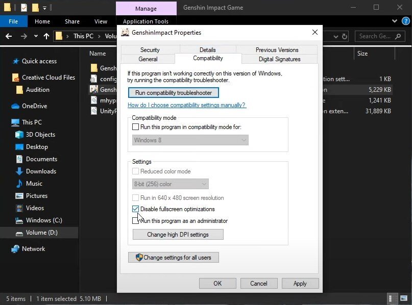 Genshin Impact 屬性 > 兼容性 > 禁用全屏優化