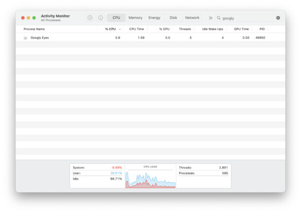 如果你費心閱讀 App Store 評論,你會看到一兩條關於 CPU 使用情況的評論,但根據我一整天運行 Googly Eyes 的經驗,它的 CPU 佔用率大多徘徊在 0.6% 左右,最高佔用率約為 5%,所以它幾乎不會對任何東西產生影響,但如果你想盡量減少渲染時間或編譯時間,也許你會想暫時保留 Googly Eyes。