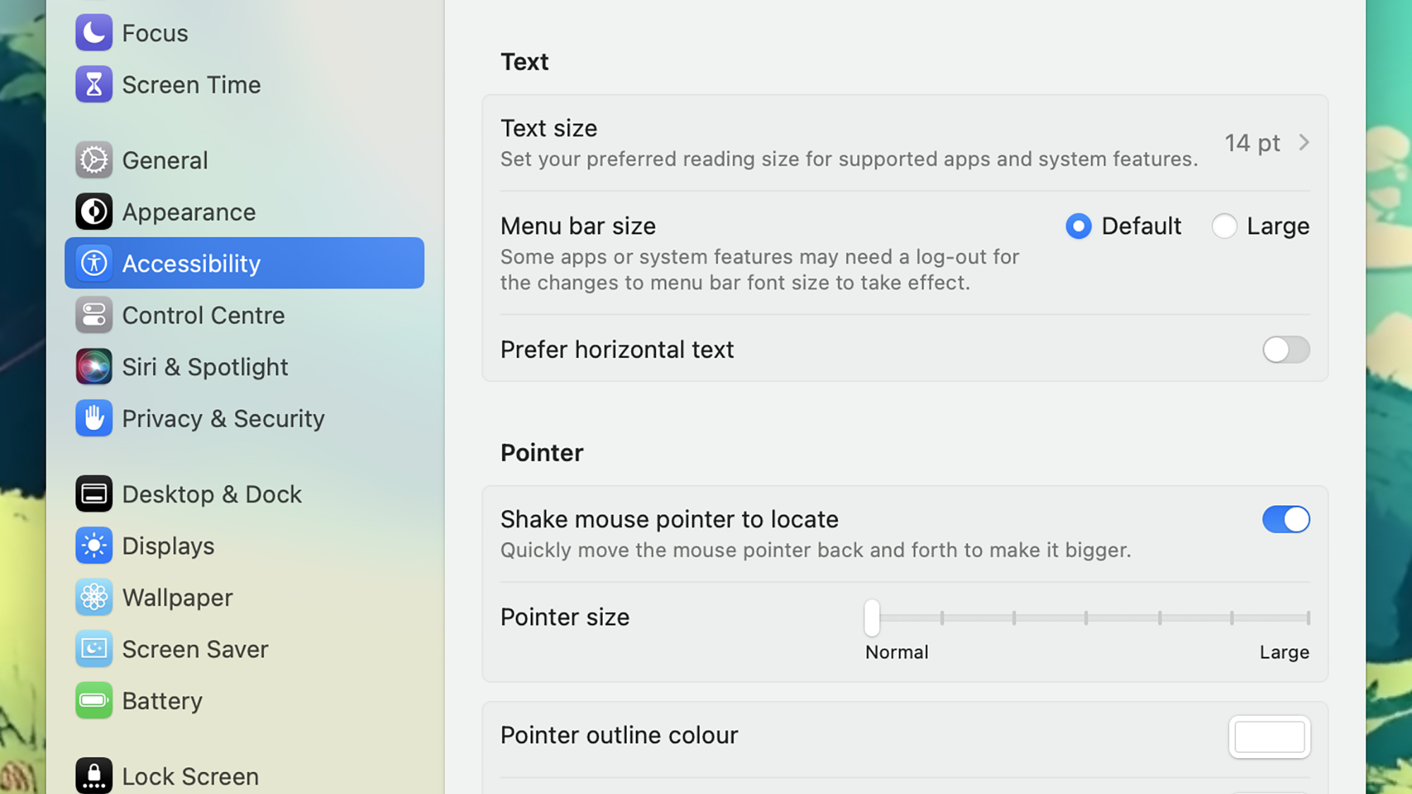 - 使用指針大小滑塊更改屏幕上鼠標或觸控板指針的大小(請注意,如果您使用它,也可以搖動指針使其變大)。還有用於更改指針輪廓和填充顏色的選項。