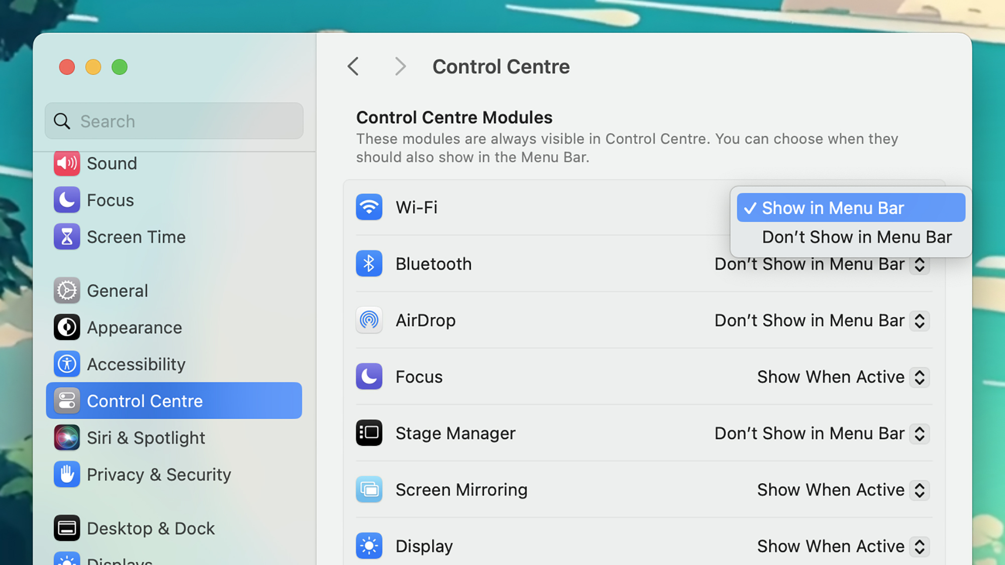 菜單欄的選項比較少,但是如果打開的話控制中心從系統設置,您可以選擇在菜單欄中顯示哪些應用程序和快捷方式圖標,也可以讓它在不使用時自動隱藏,就像擴展塢一樣。