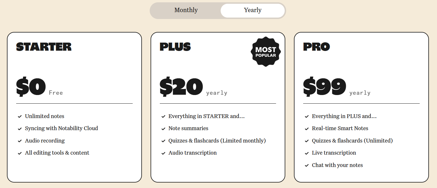 Notability提供三個級別:入門級(免費)、Plus(20 美元/年)和 Pro(99 美元/年)。