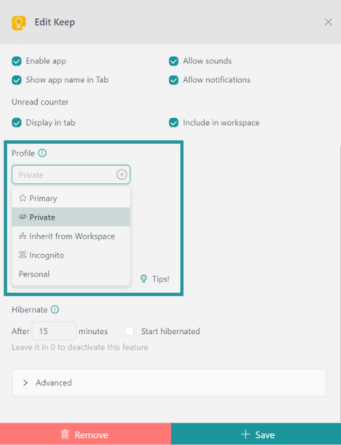 - 自定義您的 Google Keep 設置:您可以選擇是否接收操作系統通知、聆聽應用程序的聲音、分配配置文件以及調整 Rambox 提供的其他設置。