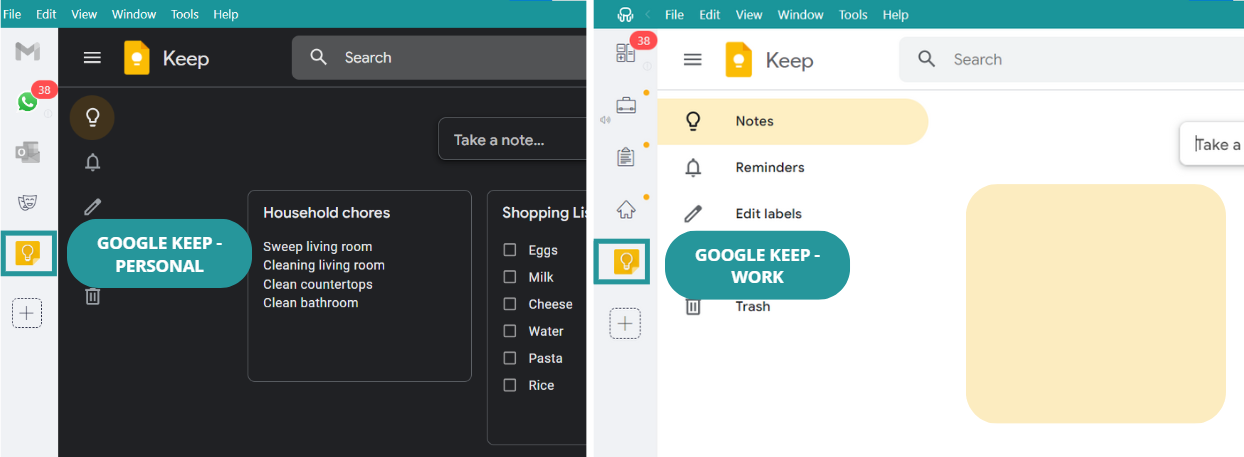 - Rambox 工作空間:此功能是整理桌面的最佳方式。如果您使用 Google Keep 執行個人和工作相關任務,Rambox 可以幫助您讓一切井井有條。例如,您可以創建兩個獨立的工作區:一個用於您的個人應用程序,例如 Google Keep、WhatsApp 等,另一個用於工作應用程序,例如用於工作任務的 Google Keep、Slack 或 Teams。這樣,您的筆記和提醒就可以在個人生活和職業生活之間完美分類。