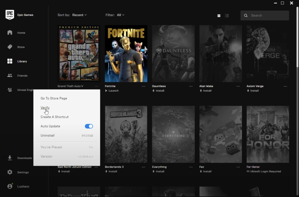 要通過 Epic Games Launcher 修復 GTA V 上的“無法啟動遊戲,請驗證遊戲數據”錯誤,您需要做的第一件事就是驗證遊戲文件。為此,請打開 Epic Games 啟動器並導航至您的庫。從那裡,打開 Grand Theft Auto V 的菜單並選擇“驗證”。此過程將檢查遊戲文件是否有任何丟失或損壞的數據,並在必要時重新下載它們。損壞的遊戲文件的示例可能包括丟失 DLL 文件,這可能會導致遊戲無法啟動。通過驗證遊戲文件,您可以確保遊戲具有正確啟動所需的所有組件。