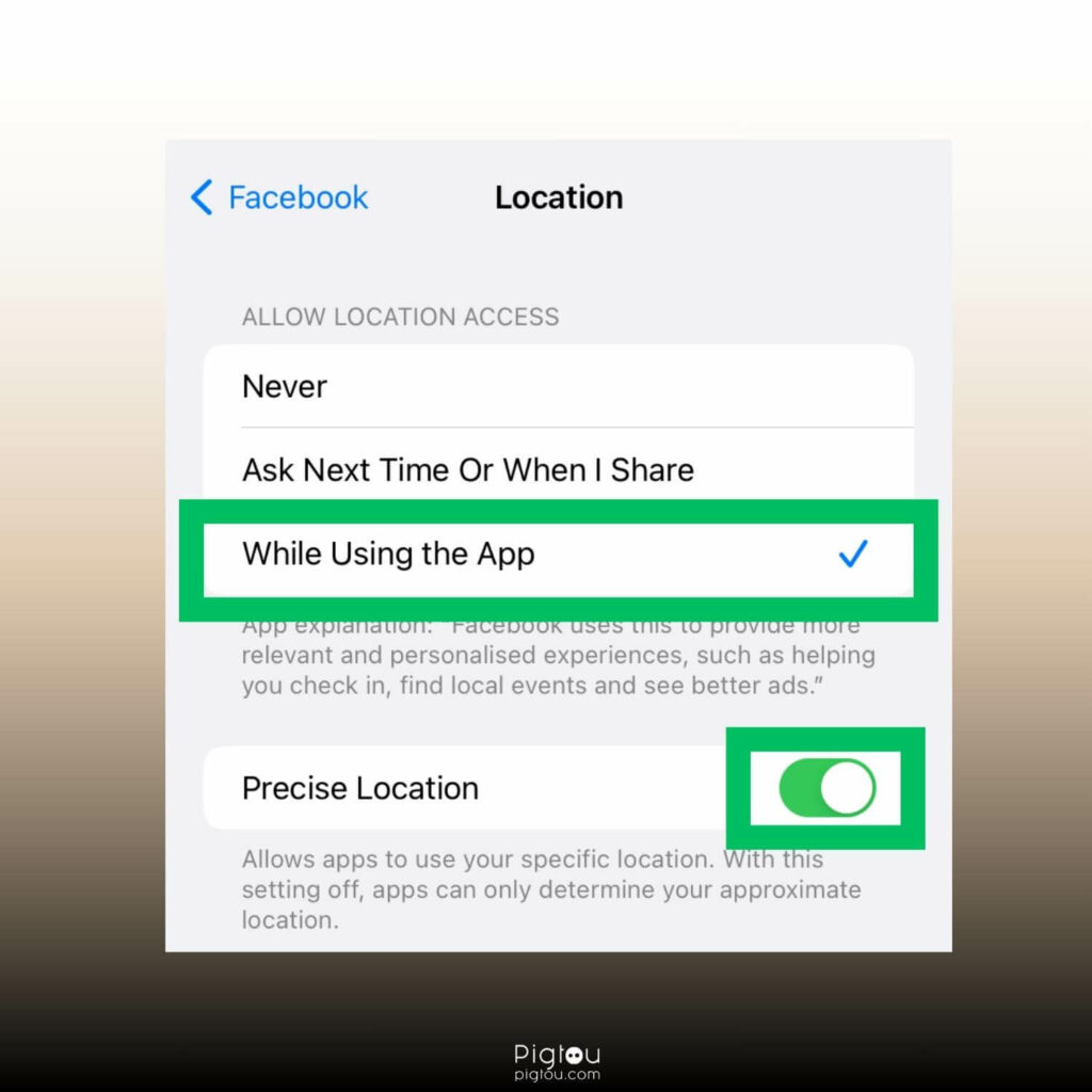 啟用對 Facebook 應用程序的位置訪問將為它提供正確的位置信息,並且可能會繞過消息傳遞錯誤。請注意,只有當您當前位於賣家所在地或附近時,此功能才有效。