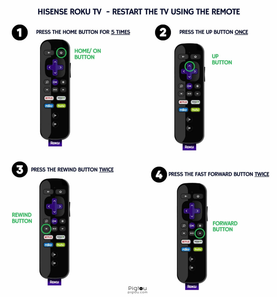 如果您找不到海信 Roku 電視上的重置按鈕,並且電視在重新啟動前會打開幾分鐘,您可以按順序按遙控器上的一組按鈕來重置電視。