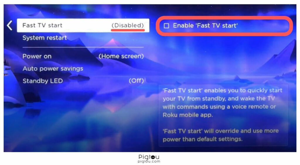 這“電視快速啟動”該功能可快速將您的海信 Roku 電視從待機狀態啟動,並使用語音助手或 Roku 移動應用程序通過命令將其喚醒,使您能夠將音樂或視頻投射到電視上。但是,它可能會導致您的電視不停地重新啟動。