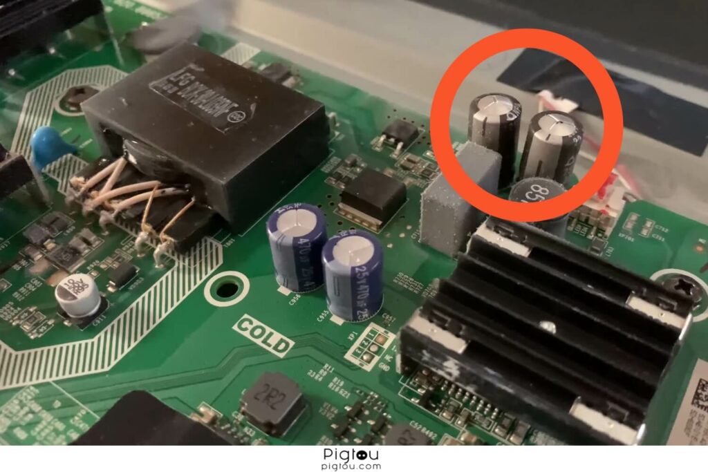 - 拆下電視後蓋並檢查燒毀的電容器(它們應該出現在頂部)