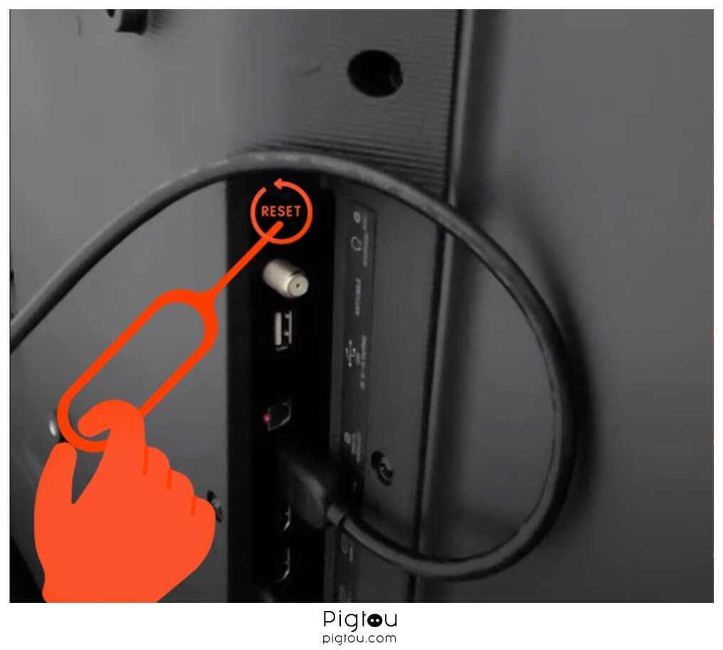 - 找到電視側面或背面的重置按鈕(孔),通常標記為“重置”