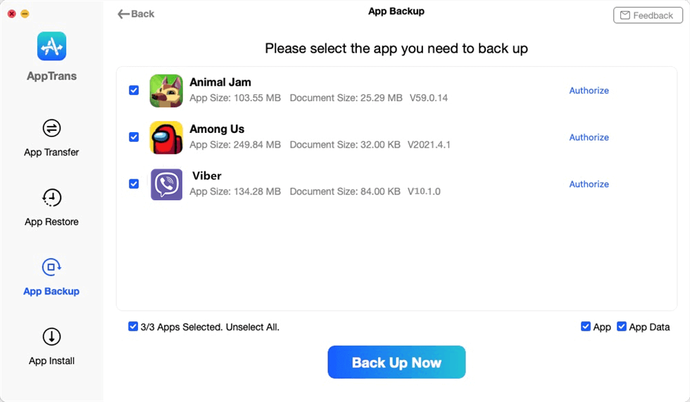 - AppTrans 為您提供了更多的餘地,您可以選擇僅備份選定的應用程序和數據。