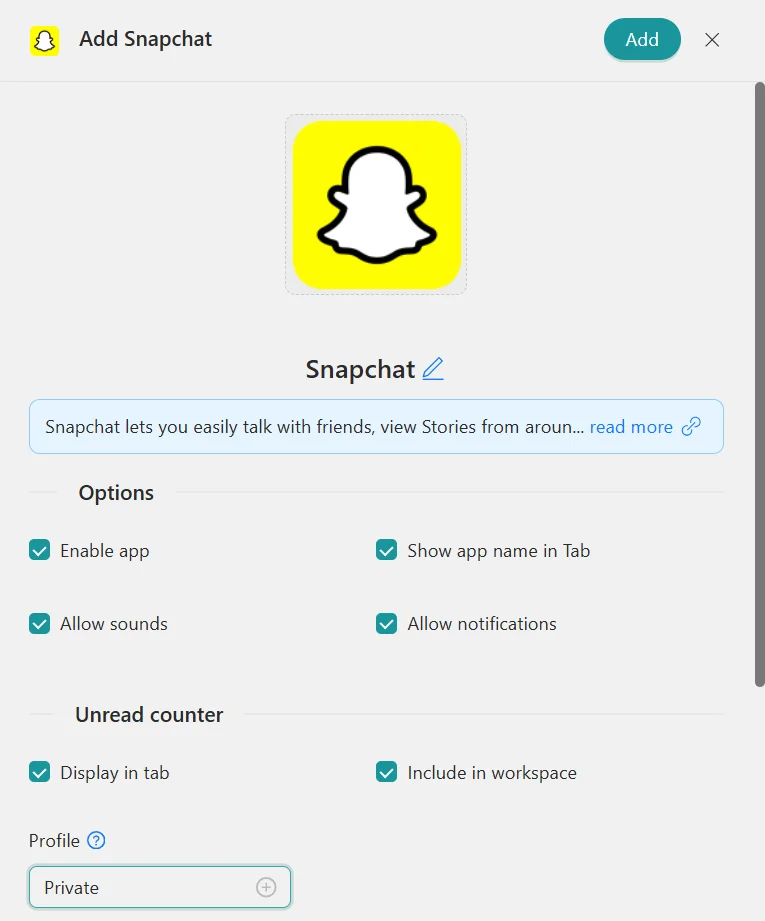 - 點擊 ”+添加”就這樣!您就可以直接從桌面上的自己的窗口中使用 Snapchat,無需瀏覽器。