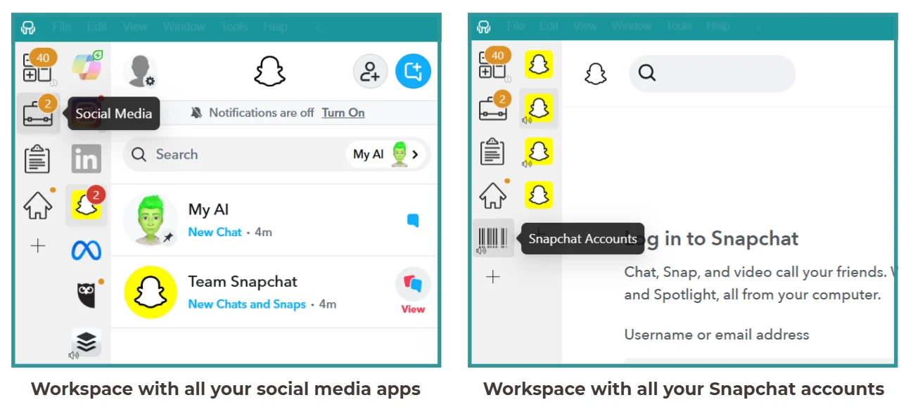 如果您為不同的客戶、市場或活動管理 Snapchat 帳戶,工作區可幫助您保持一天的整潔。您可以為每個客戶或項目創建一個工作區,並添加您使用的所有應用程序:Snapchat、電子郵件、多個雲端硬盤應用程序、Slack、多個 TikTok 帳戶,無論您需要什麼。只需單擊一下即可輕鬆切換工作環境。