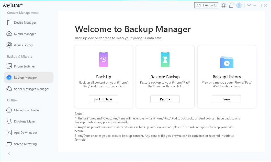 如果您決定將設備更新到新的 iOS 版本,請先備份您的數據,以免數據意外丟失。那麼你可以嘗試使用AnyTrans,這是全面的 iPhone 數據管理軟件: