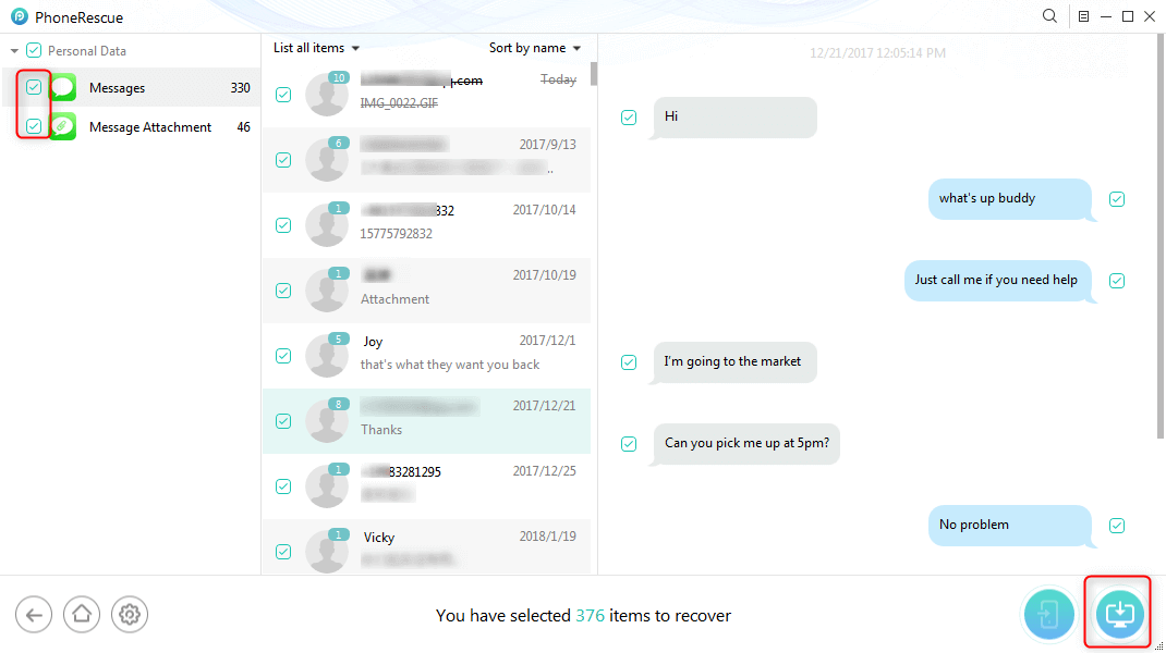 步驟3:預覽和恢復已刪除的文本對話。檢查要恢復的項目,然後單擊計算機或設備按鈕以將其檢索到您的計算機或您的iPhone。