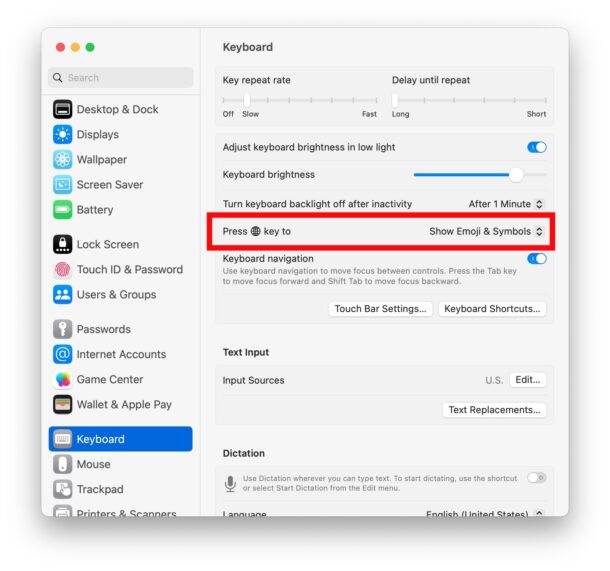 - 在“鍵盤”選項卡下,查找“按地球儀/Fn 鍵:”,然後選擇“顯示表情符號和符號”