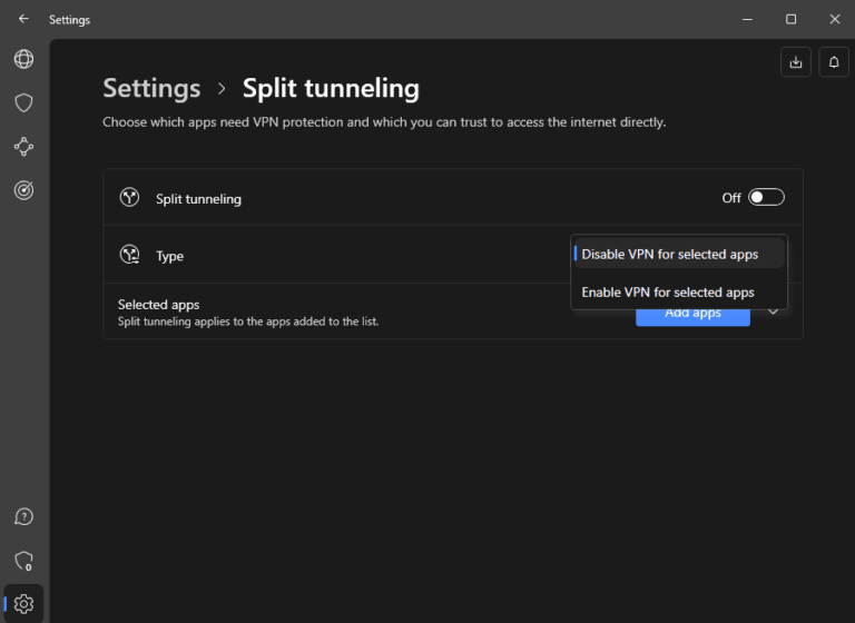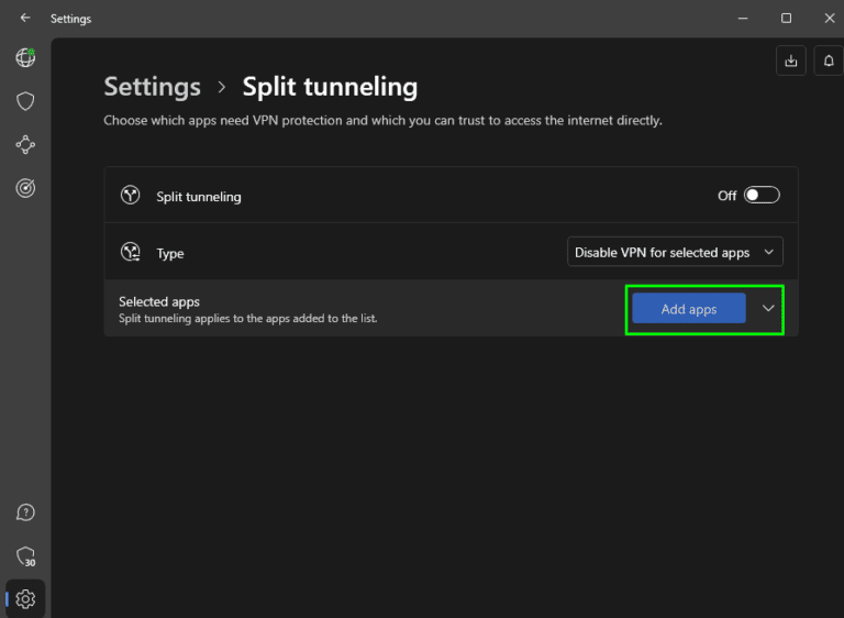 - 返回到設定>分裂隧道並點擊“選定的應用程序”以確認 Qobuz 已啟用分割隧道。