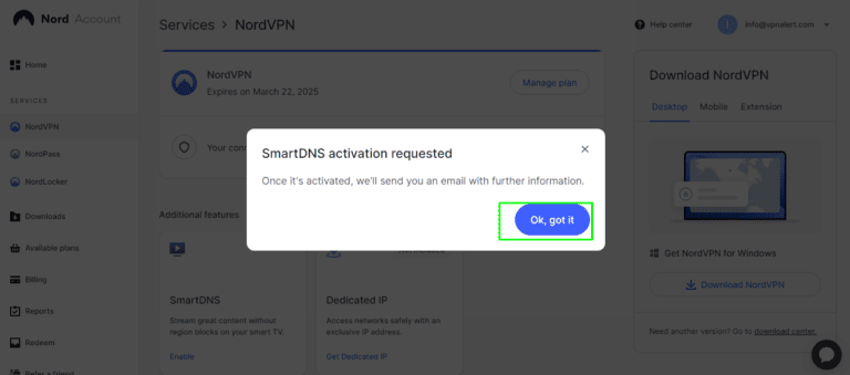 - 將出現一條消息,通知您一旦激活智能 DNS 並且您的智能 DNS 地址可用,提供商將通過電子郵件通知您。點擊 ”好的,明白了”。