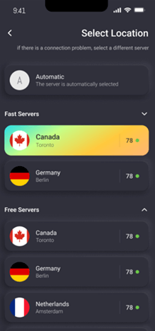 打開 BearVPN 應用程序並單擊快速連接,或者從內容過濾更寬鬆的地區(例如美國或歐洲)手動選擇服務器。