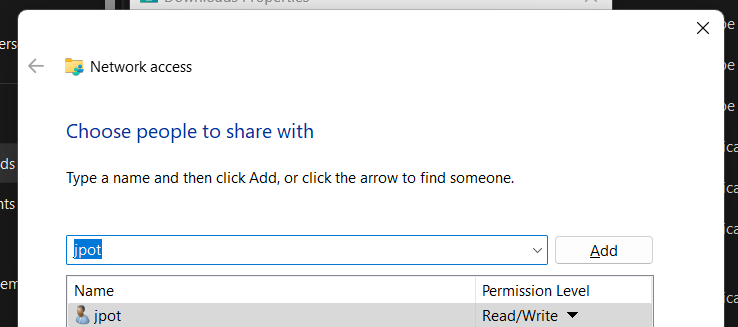 現在是時候共享一些文件夾了。在 Windows 上,您可以通過在 Windows 資源管理器中右鍵單擊任何文件夾,然後單擊特性。單擊分享選項卡,然後單擊分享按鈕。添加您剛剛創建的帳戶,然後為其授予所需的權限。