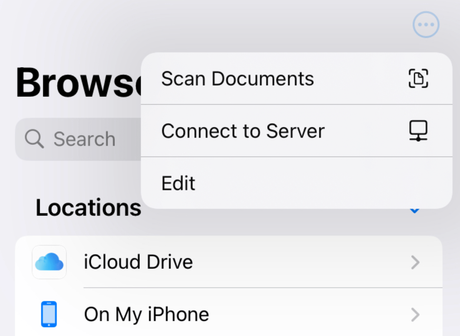 如果您的網絡上已有共享文件夾,則可以在 iPhone 和 iPad 上預裝的“文件”應用程序中連接到它們。點擊 iPhone 右上角的三點菜單;相同的按鈕位於 iPad 左側邊欄的右上角。輕敲連接到服務器。