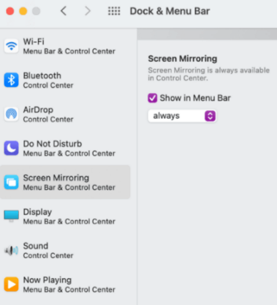 步驟 4。不要忘記導航到“系統偏好設置”,選擇“Dock & 菜單欄”,然後選擇“屏幕鏡像”。單擊“在菜單欄中顯示”。