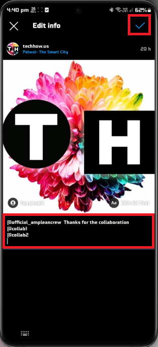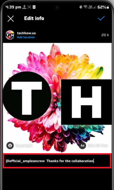 選擇要編輯的帖子後,點擊右上角的三點菜單圖標。選擇“編輯”,然後在標題字段中插入協作者的用戶名,每個用戶名前面都有一個“@”符號。