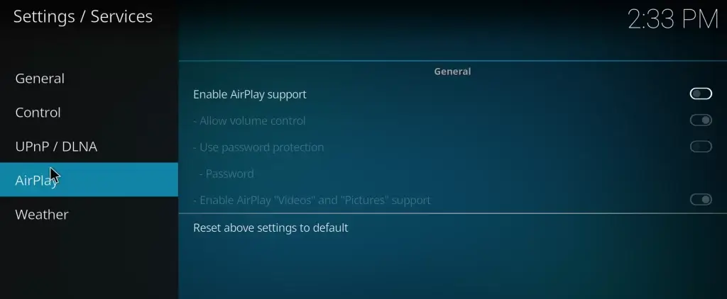 4。啟動Kodi應用程序後,在Kodi上啟用AirPlay。