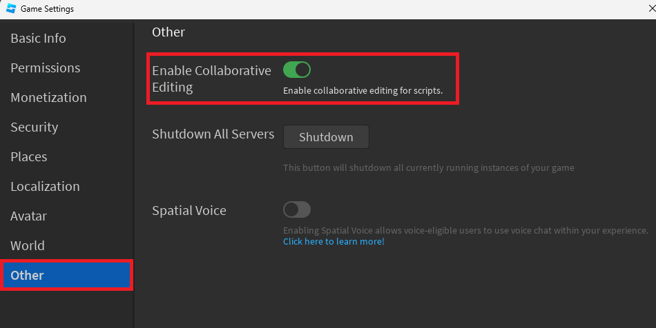 在“其他”部分中,確保啟用“協作編輯”選項,該選項還允許用戶編輯 Roblox Studio 腳本。