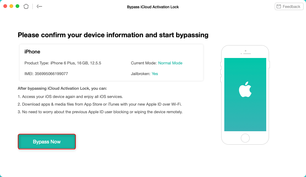 步驟 3.越獄過程完成後,確認您設備的詳細信息,然後點擊立即繞過按鈕。然後 AnyUnlock 將開始繞過您的 iCloud 激活鎖。