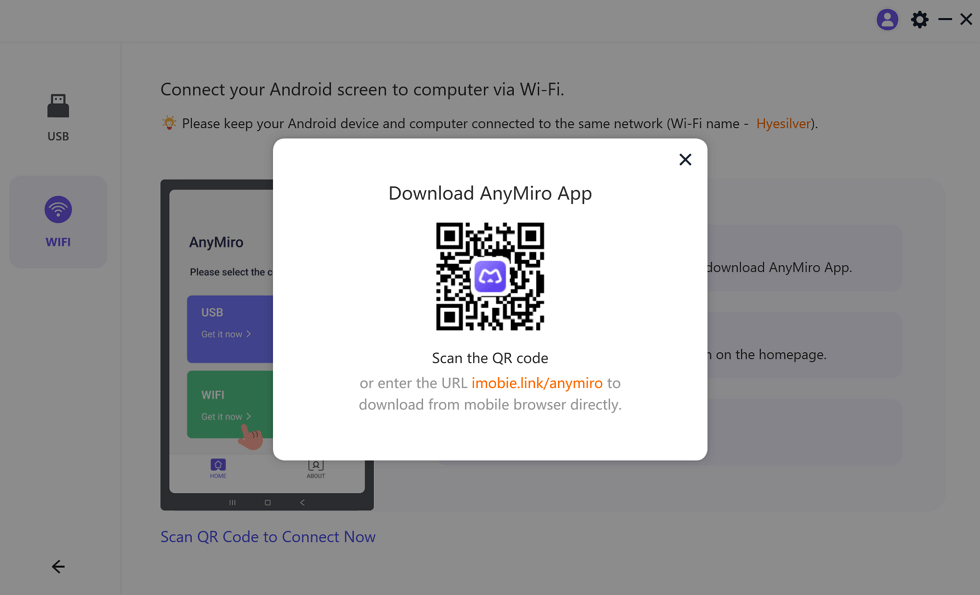步驟 3.從 Google Play 下載 AnyMiro 應用程序,打開它,然後點擊 WiFi 連接。
