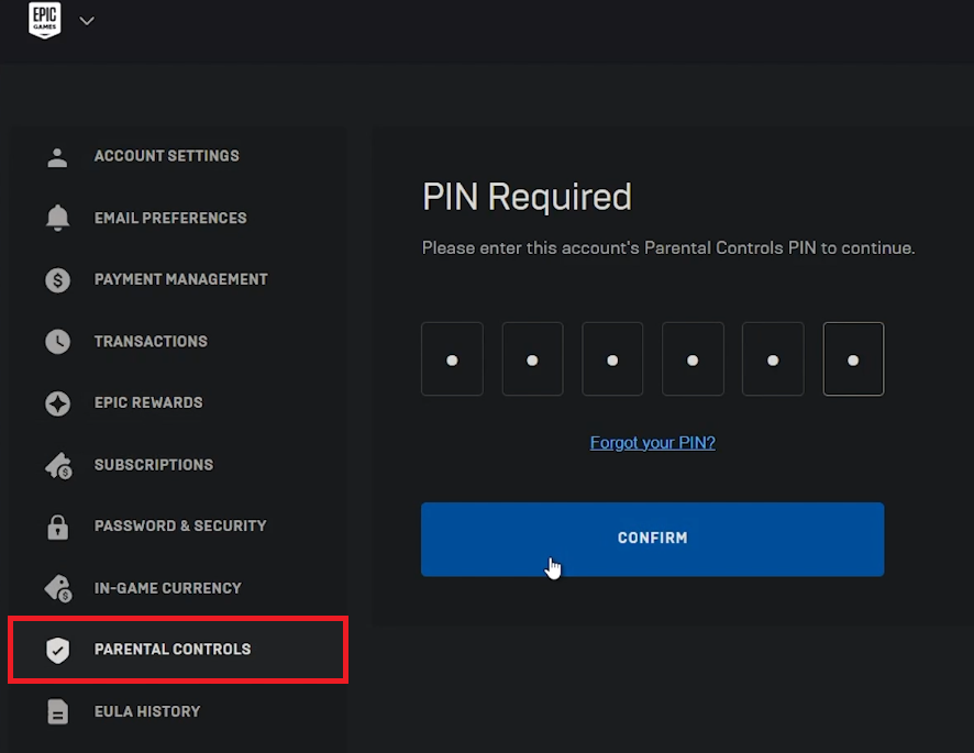 單擊 Epic Games 啟動器中的個人資料圖標並導航至“帳戶”,然後導航至“家長控制”即可訪問家長控制。
