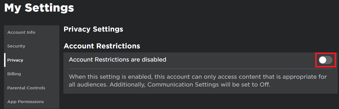 您可以在 Roblox 設置的“隱私”部分中管理帳戶限制,您可以根據自己的喜好選擇啟用或禁用它們。