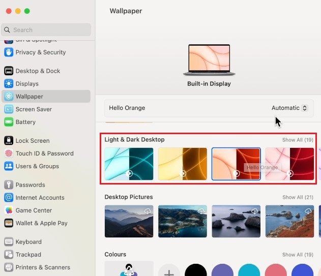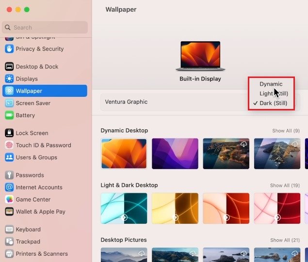 導航至壁紙部分。在這裡,您可以選擇不同類型的壁紙。這動態桌面壁紙可以設置為淺色或深色版本。您還可以選擇將此選項設置為動態的。桌面壁紙將根據一天中的時間和位置而變化。第一行中的所有壁紙都有動態設置,儘管有些壁紙需要先下載。