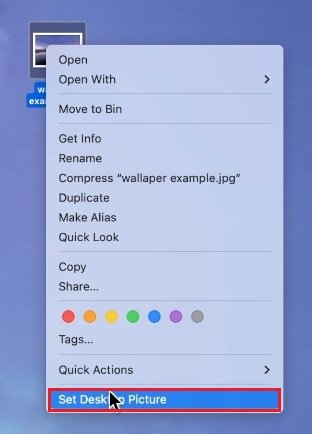 或者,您可以右鍵單擊您的任何圖像發現者或桌面並選擇設置桌面圖片。這會將您的壁紙更改為選定的圖像,而無需在您的設置中查找它。