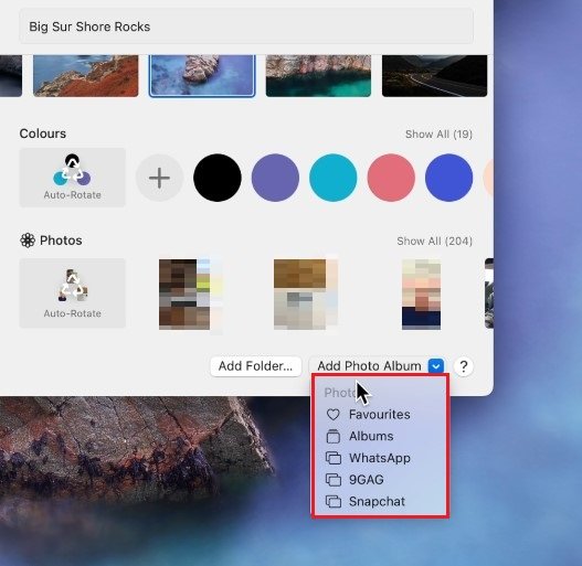 接下來,您還可以選擇此列表中的一張圖片。如果您更喜歡使用 Mac 上保存的一張圖片,請單擊添加相冊。接下來,選擇您喜歡的專輯或選擇照片在此列表中查找您保存的所有照片。