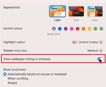 下面,啟用或禁用允許窗口中的壁紙著色選項。此設置將允許壁紙的某些顏色透過活動窗口閃耀。