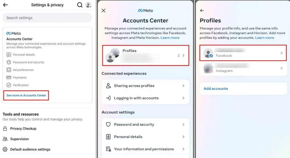- 點擊帳戶中心並選擇個人資料。然後點擊你的名字。