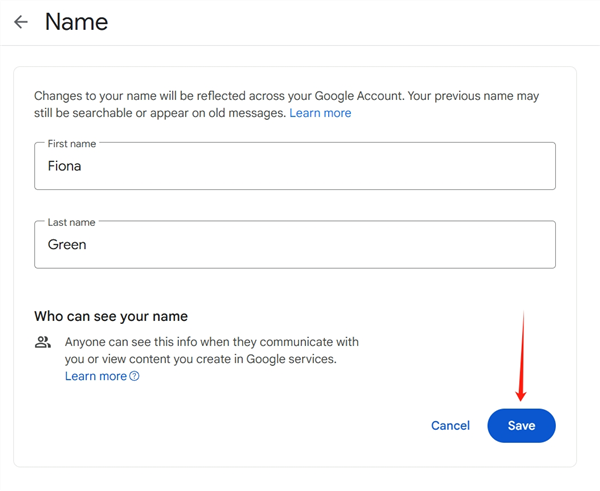 - 更改您的名字和姓氏。然後單擊“保存”。
