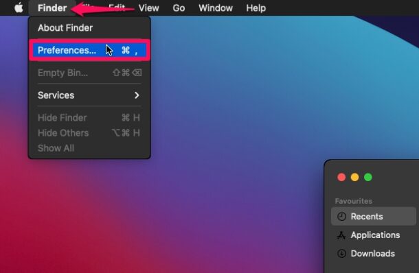 - 現在,確保 Finder 窗口處於活動狀態,然後單擊頂部菜單欄中的 Finder -> 首選項,如下所示。