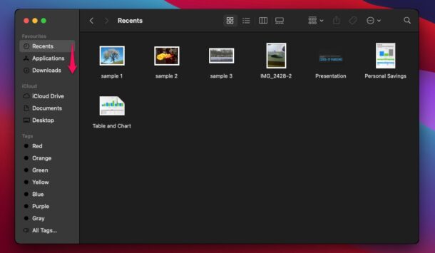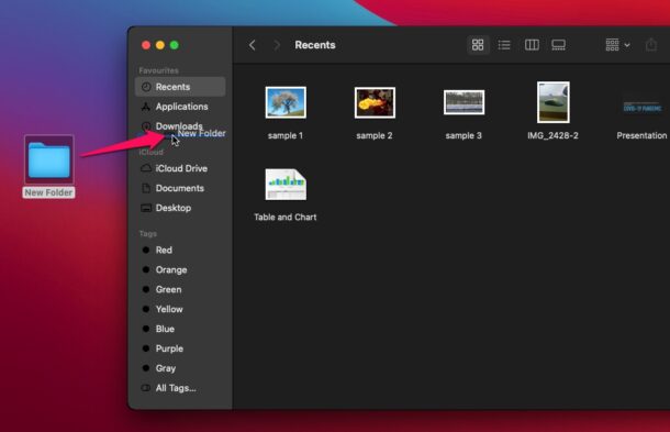 - 您也可以將 Mac 上存儲的任何文件夾添加到側邊欄。只需將文件夾拖放到側邊欄項目之間,如下面的屏幕截圖所示。
