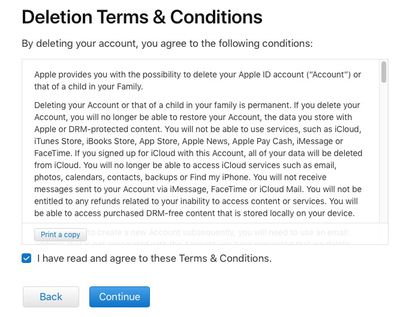 - 查看刪除條款和條件,勾選已閱讀並同意框,然後選擇繼續。