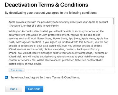- 查看停用條款和條件,選中“閱讀並同意”框,然後選擇繼續。